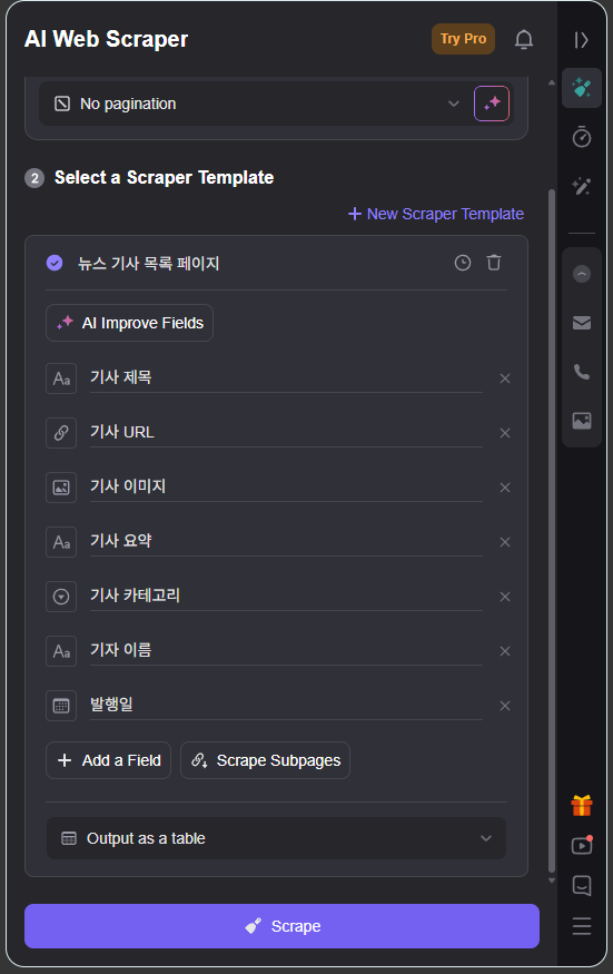 - 사용자 친화성: 코딩 지식 없이도 누구나 쉽게 데이터를 추출할 수 있도록 설계되었습니다. 특히, 데이터 수집을 원하는 내용을 자연어로 입력하면 AI가 자동으로 스크래퍼를 설정해줍니다.