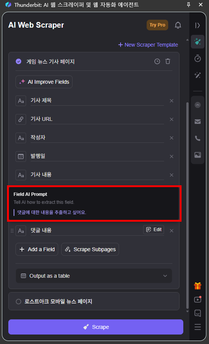 더불어, 추가한 필드의 영역에 값을 어떻게 채워넣을 것인지에 대한 프롬프트를 작성하면 입력된 프롬프트에 맞춰 수집을 진행합니다.