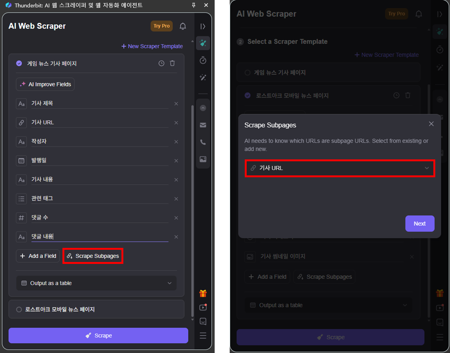'Scrape Subpages' 기능을 통해, 서브페이지를 탐색하여 데이터 수집을 진행할 수 있습니다.