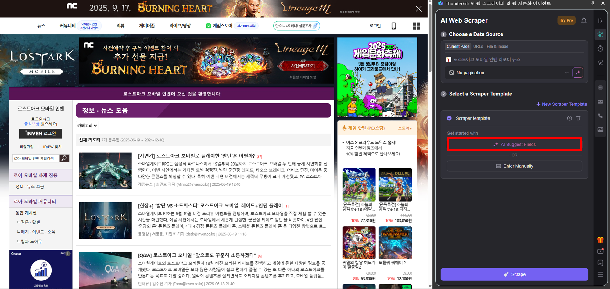 - 크롤링하고자 하는 페이지에 접속 후, 'AI Suggest Fields'를 클릭하여 자동으로 수집할 수 있는 데이터 필드 영역을 제공받을 수 있습니다.