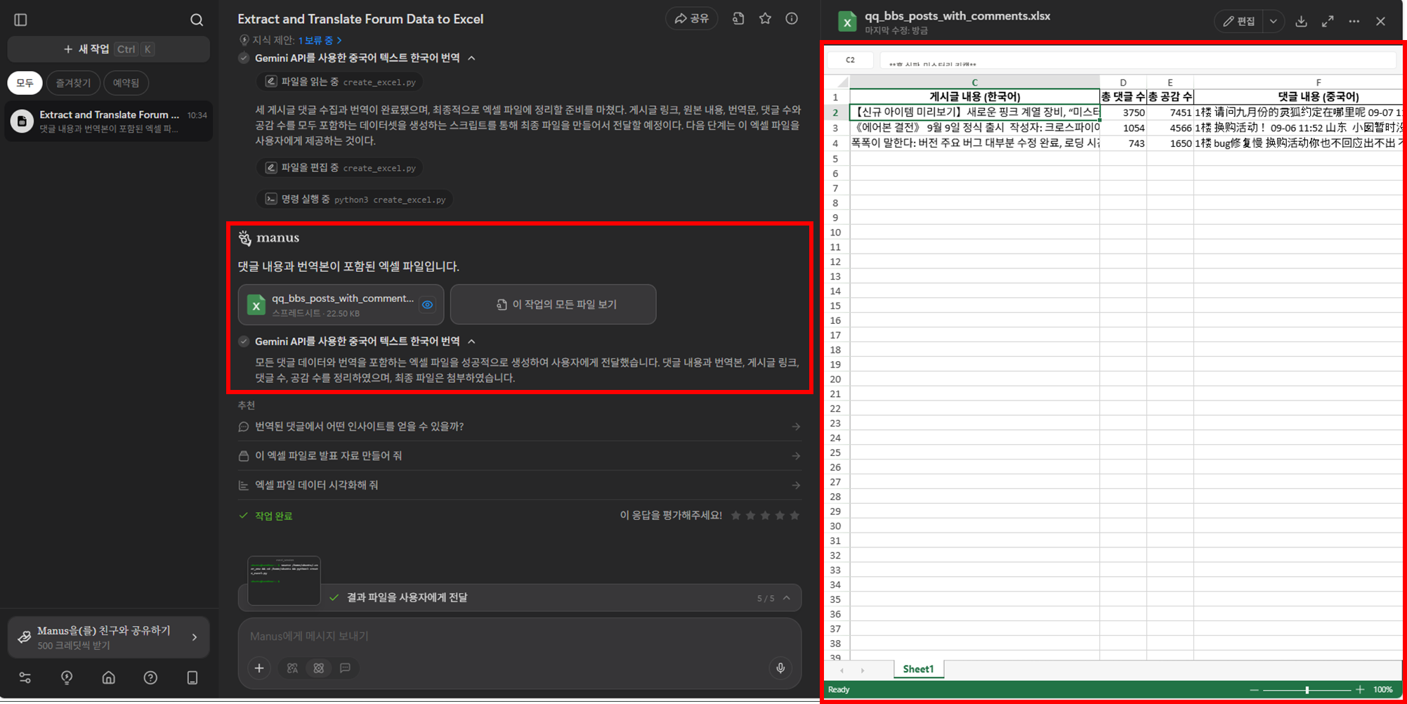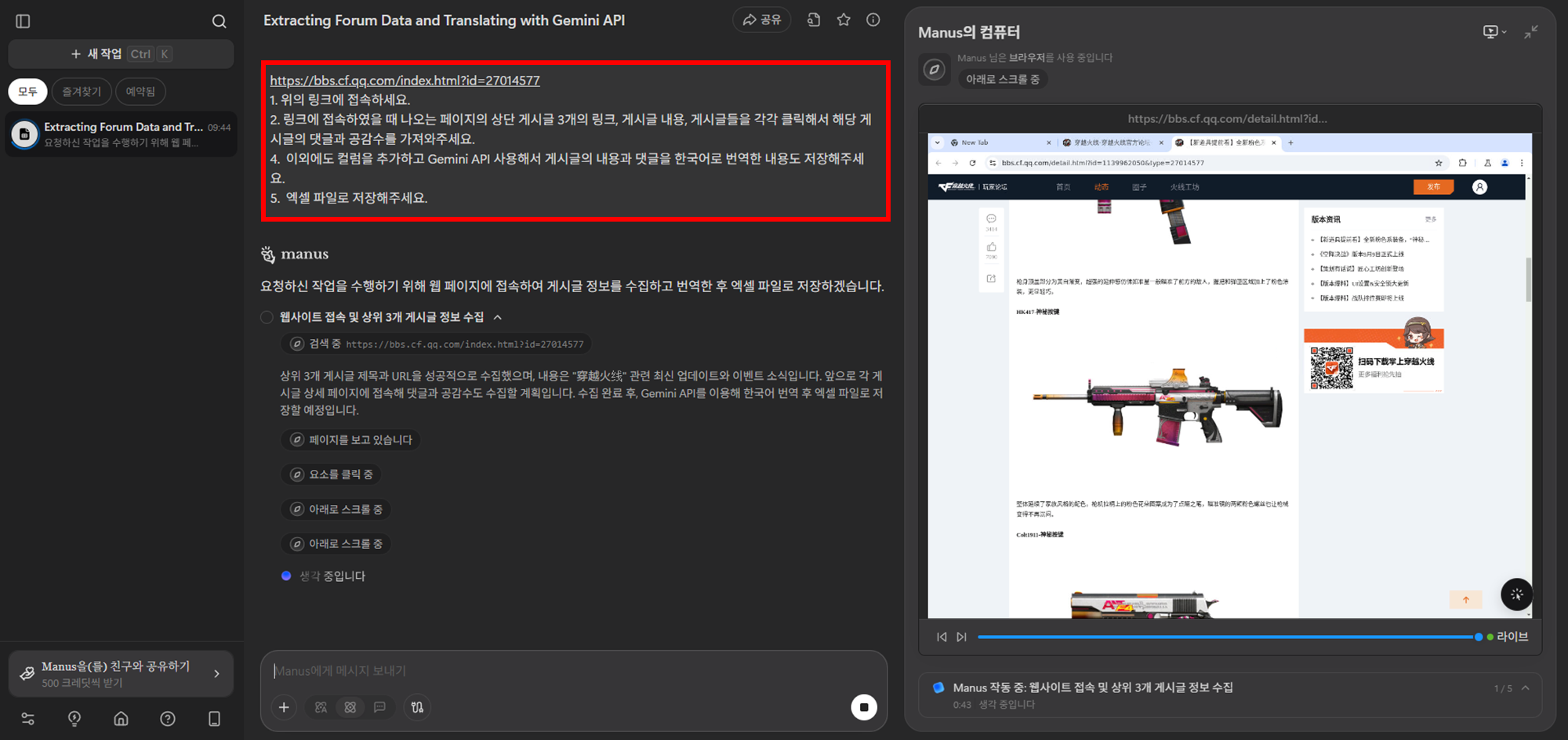 | 다국어 이해 | 중국어로 된 해외 게임 커뮤니티에서 '특정 키워드(예: 신규 클래스)'가 포함된 게시글과 댓글을 찾아 수집하고, 그 내용을 실시간으로 한국어 번역하여 보고서로 정리하는 등 복잡한 크롤링 작업을 수행 가능 |