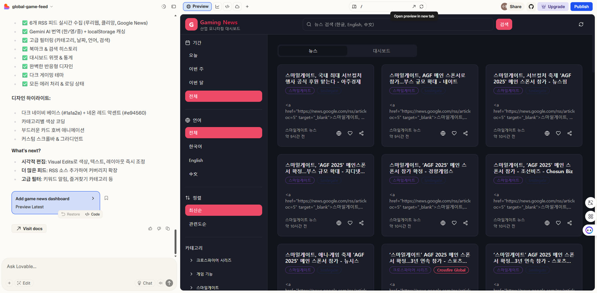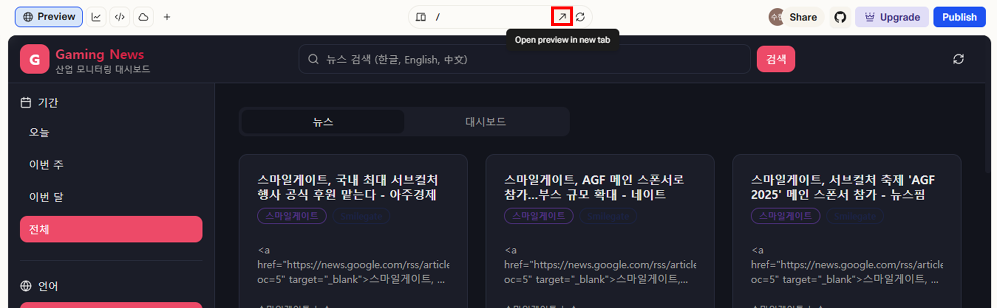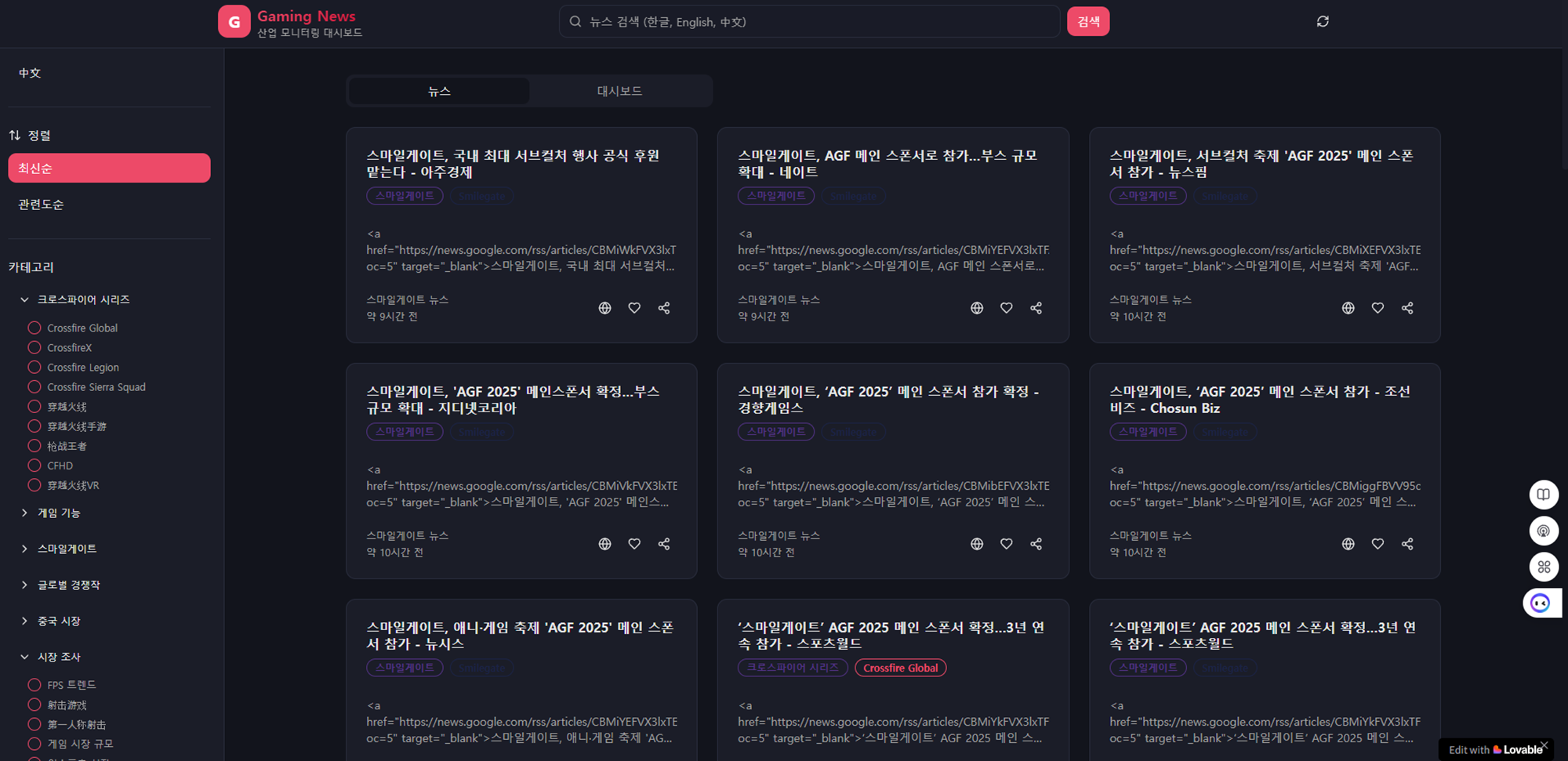 | 해외 게임 산업 뉴스 모니터링 대시보드 ------------------------------------------------------------ API 설정 ------------------------------------------------------------ RSS2JSON API - 엔드포인트: https://api.rss2json.com/v1/api.json?rss_url={RSS주소} - 주의사항: 무료 버전에서는 count 파라미터를 사용하지 말 것 Gemini API - API 키: (발급받은 API키를 입력하세요) - 엔드포인트: https://generativelanguage.googleapis.com/v1beta/models/gemini-1.5-flash:generateContent?key={API_KEY} - 요청 형식: POST - 헤더: Content-Type: application/json - 요청 Body: { "contents": [{ "parts": [{ "text": "번역할 텍스트" }] }] } - 응답 파싱: candidates[0].content.parts[0].text ------------------------------------------------------------ 데이터 소스 ------------------------------------------------------------ RSS 피드 목록 - 루리웹 게임뉴스: https://bbs.ruliweb.com/news/board/1001/read/rss - 클리앙 새소식: https://www.clien.net/service/rss/allrecentnews - 크로스파이어 뉴스: https://news.google.com/rss/search?q=크로스파이어&hl=ko - 발로란트 뉴스: https://news.google.com/rss/search?q=발로란트&hl=ko - 델타포스 뉴스: https://news.google.com/rss/search?q=델타포스&hl=ko - 스마일게이트 뉴스: https://news.google.com/rss/search?q=스마일게이트&hl=ko ------------------------------------------------------------ UI 레이아웃 ------------------------------------------------------------ 상단 네비게이션 - 로고 (좌측) - 검색 입력창 (중앙) - 새로고침 버튼 (우측) 좌측 사이드바 - 너비: 280px - 모바일: 오버레이 방식 - 카테고리 필터 (접기/펼치기 가능) - 체크박스 다중 선택 메인 콘텐츠 - 활성 필터 태그 (제거 가능) - 정렬 옵션 바 - 뉴스 카드 그리드 - 데스크톱: 3열 - 태블릿: 2열 - 모바일: 1열 ------------------------------------------------------------ 카테고리 구조 ------------------------------------------------------------ 크로스파이어 시리즈 Crossfire Global, CrossfireX, Crossfire Legion, Crossfire Sierra Squad, 穿越火线, 穿越火线手游, 枪战王者, CFHD, 穿越火线VR 게임 기능 나노모드, 랭크매치, UGC, AI 모드, CF패스 스마일게이트 회사 뉴스, Smilegate, Smilegate Entertainment, 기업 IR 글로벌 경쟁작 Valorant, Delta Force, Call of Duty, Apex Legends, Rainbow Six Siege, Counter-Strike 2, CS:GO, Overwatch 2, Escape From Tarkov, The Finals, PUBG Battlegrounds 중국 시장 无畏契约, 三角洲行动, 使命召唤, 和平精英, 逆战, 反恐精英, 守望先锋, 彩虹六号, 绝地求生 시장 조사 FPS 트렌드, 射击游戏, 第一人称射击, 게임 시장 규모, 이스포츠 시장, VR 게임 시장, 글로벌 게임 수익 ------------------------------------------------------------ 기사 카드 디자인 ------------------------------------------------------------ 카드 구성 요소 - 썸네일 이미지 (16:9 비율, 로드 실패 시 기본 이미지) - 제목 (최대 2줄, 말줄임 처리) - 출처명 + 발행일 - 요약문 (최대 3줄, 말줄임 처리) - 카테고리 태그 (색상 구분) - 번역 버튼 (우측 상단, 🌐 아이콘) - 북마크 버튼 (❤️ 아이콘) - 공유 버튼 (🔗 아이콘) 카드 상호작용 - 전체 클릭: 새 탭에서 원문 열기 - 호버 효과: 상승 애니메이션 + 그림자 강화 - 북마크: localStorage 저장 - 공유: URL 클립보드 복사 + 토스트 알림 ------------------------------------------------------------ 검색 및 필터 기능 ------------------------------------------------------------ 검색 - 키워드 검색 (제목 + 요약문) - 다국어 지원 (한글, 영어, 중국어) 필터 옵션 - 날짜: 오늘, 이번 주, 이번 달, 전체 - 언어: 전체, 한국어, 영어, 중국어 - 카테고리: 다중 선택 정렬 - 최신순 (기본값) - 관련도순 ------------------------------------------------------------ 번역 기능 ------------------------------------------------------------ 번역 UI - 우측 상단 🌐 버튼 - 드롭다운: 한국어로 번역, 영어로 번역, 중국어로 번역 - 로딩 중 스피너 표시 - 원문/번역 토글 버튼 번역 처리 - Gemini API 호출 - localStorage 캐싱 - 실패 시 원문 유지 ------------------------------------------------------------ 대시보드 위젯 ------------------------------------------------------------ 최근 검색 기록 - 최대 10개 표시 - 클릭 시 해당 키워드로 필터링 - 개별 삭제 가능 저장한 기사 - 북마크한 기사 목록 - 작은 카드 형태 표시 언어별 통계 - 수집된 기사의 언어 분포 - 차트 형태로 시각화 빠른 키워드 접근 - 자주 사용하는 키워드 버튼 - 즉시 필터링 적용 ------------------------------------------------------------ 기술 스택 ------------------------------------------------------------ 프론트엔드 - React 18 - TypeScript - Tailwind CSS 상태 관리 - Zustand UI 라이브러리 - Lucide React (아이콘) 유틸리티 - date-fns (날짜 처리) - localStorage (로컬 저장소) ------------------------------------------------------------ 에러 처리 및 안정성 ------------------------------------------------------------ 필수 구현 사항 - 모든 API 호출에 try-catch 적용 - RSS 피드 개별 에러 처리 - 이미지 로드 실패 처리 (onError) - 번역 API 실패 시 원문 표시 - localStorage 접근 실패 대응 - null/undefined 체크 - 배열 연산 전 유효성 검증 - 로딩 상태 UI - 빈 데이터 상태 UI ------------------------------------------------------------ 구현 단계 ------------------------------------------------------------ 1단계: 기본 구조 - 레이아웃 컴포넌트 구성 - RSS 데이터 fetch 함수 - 기사 카드 컴포넌트 2단계: 필터링 시스템 - 카테고리 필터 UI - 검색