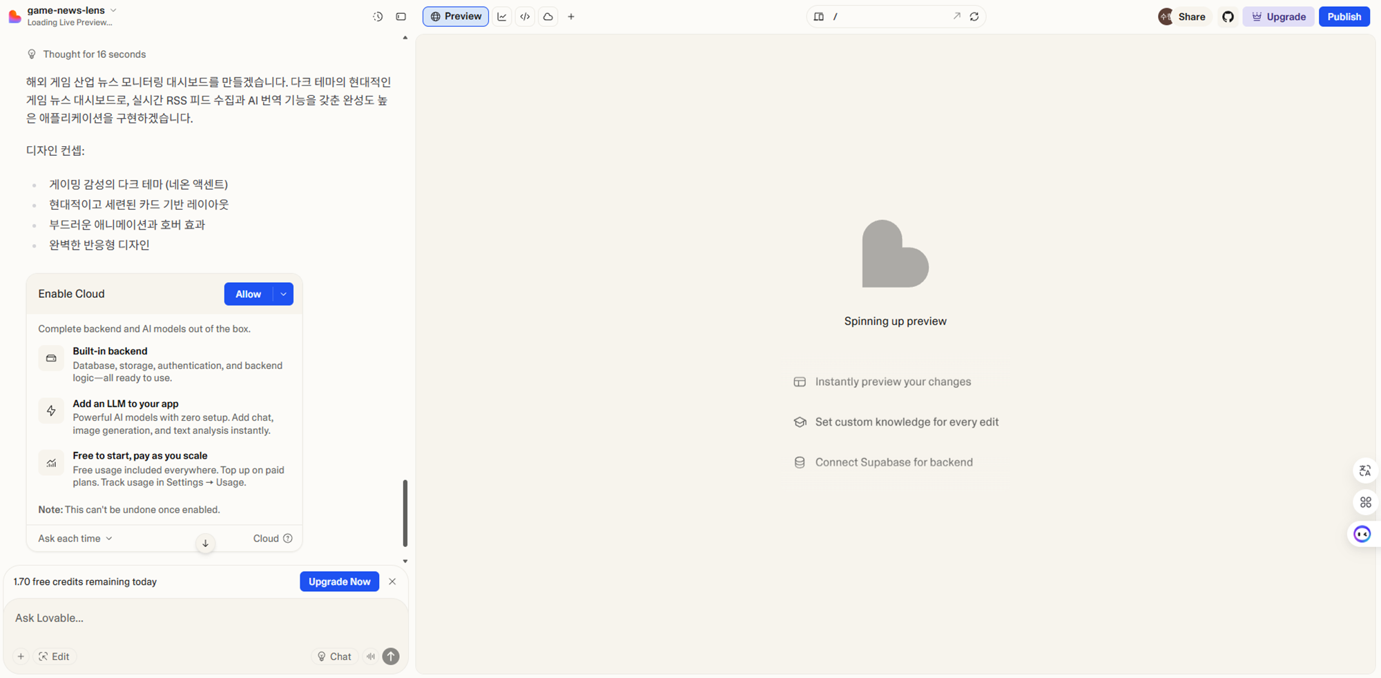 | 개발자 관점 | - 코딩 지식 없이도 풀기능 앱 개발 - 직관적인 자연어 인터페이스 - 빠른 프로토타입 제작 가능 - 상세한 계획 단계로 명확한 개발 프로세스 |