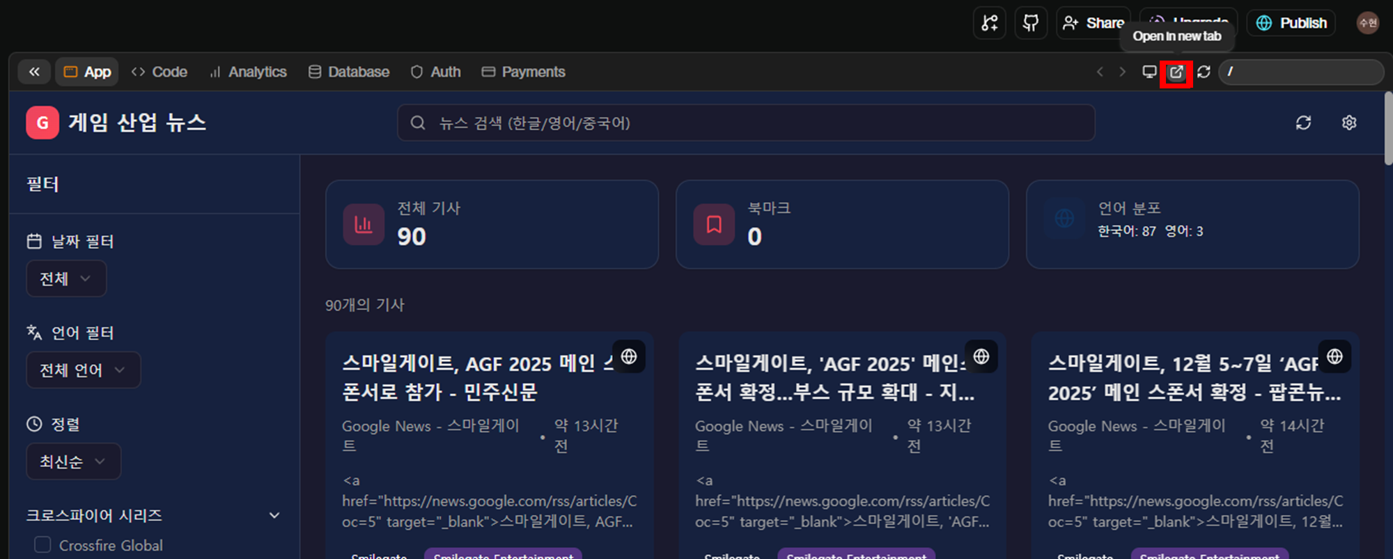 4️⃣ 상단에 Open in new tab을 클릭하면, 새로운 페이지에 접속하여 만들어진 웹 애플리케이션을 확인할 수 있습니다.