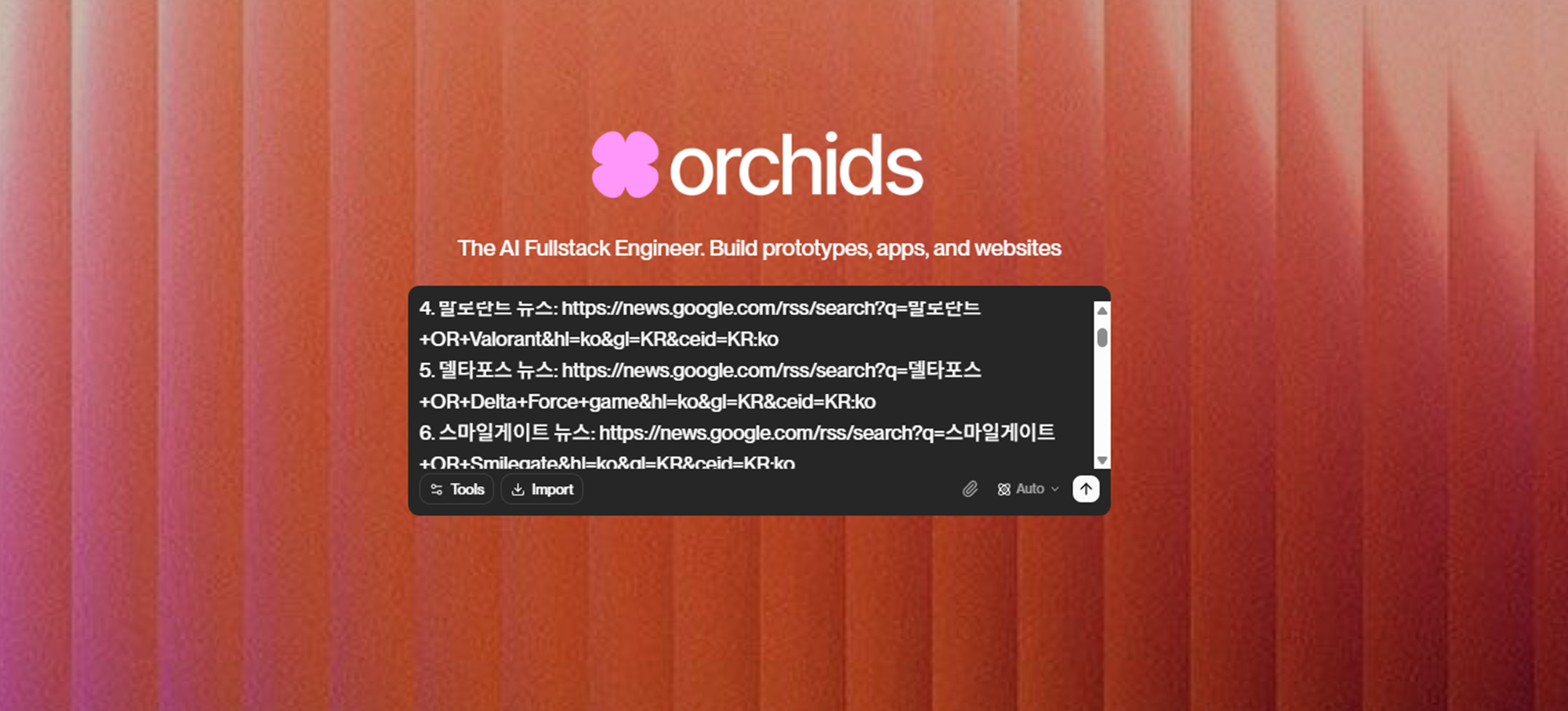 Orchids는 자연어 프롬프트를 통해 프론트엔드부터 백엔드까지 전체 스택을 생성하는 AI 기반의 웹 애플리케이션 개발 플랫폼입니다.
