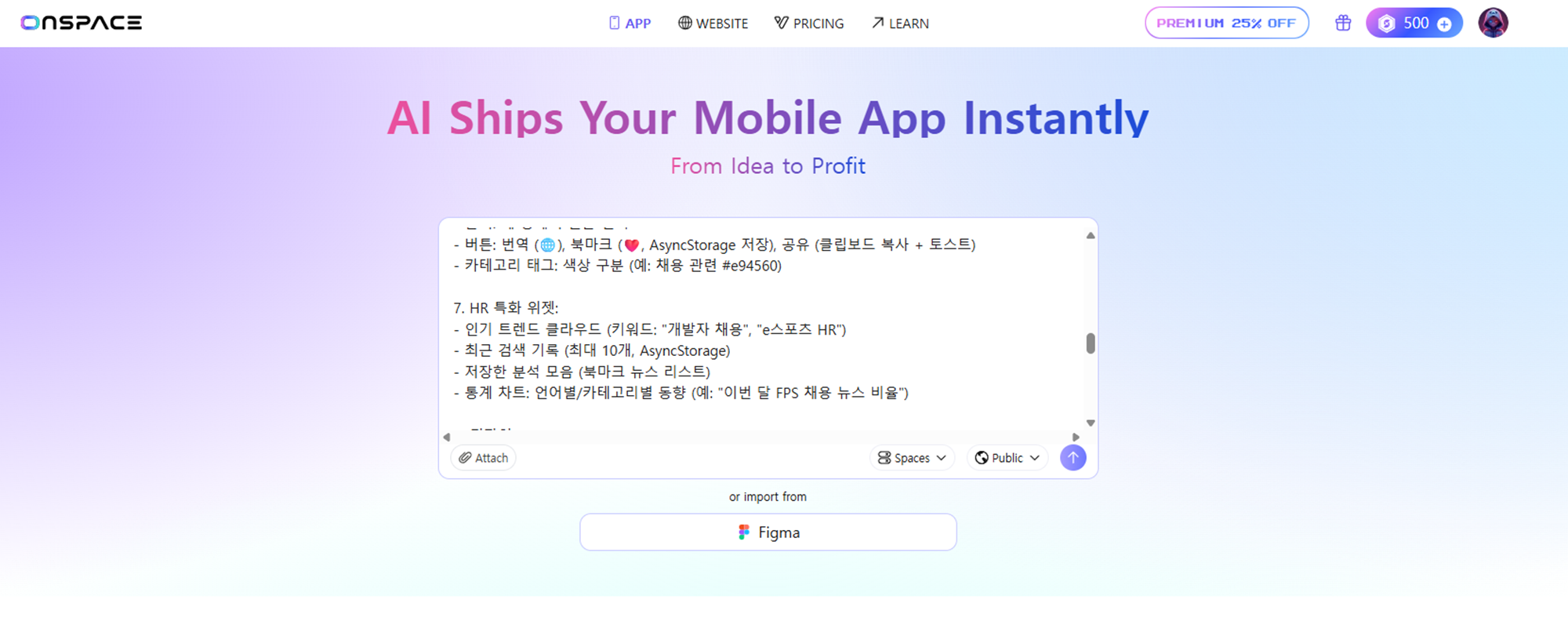 1️⃣ Onspace 사이트 접속 후, 아래의 프롬프트 입력