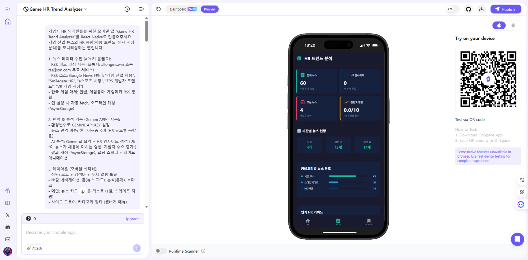| 게임사 HR 임직원들을 위한 모바일 앱 "Game HR Trend Analyzer"를 React Native로 만들어주세요. 게임 산업 뉴스와 HR 동향(채용 트렌드, 인재 시장 분석)을 모니터링하는 앱입니다. 1. 뉴스 데이터 수집 (API 키 불필요): - RSS 피드 파싱 사용 (프록시: allorigins.win 또는 rss2json.com 무료 서비스) - RSS 소스: Google News (쿼리: "게임 산업 채용", "Smilegate HR", "e스포츠 시장", "FPS 개발자 트렌드", "VR 게임 시장") - 한국 게임 매체: 인벤, 게임동아, 게임메카 RSS 통합 - 앱 실행 시 자동 fetch, 오프라인 캐싱 (AsyncStorage) 2. 번역 & 분석 기능 (Gemini API만 사용): - 환경변수로 GEMINI_API_KEY 설정 - 뉴스 번역 버튼: 한국어↔중국어 (글로벌 동향용) - AI 분석: Gemini로 요약 + HR 인사이트 생성 (예: "이 뉴스가 채용에 미치는 영향: 개발자 수요 증가") - 결과 캐싱 (AsyncStorage), 로딩 스피너 + 페이드 애니메이션 3. 레이아웃 (모바일 최적화): - 상단: 로고 + 검색바 + 푸시 알림 토글 - 바텀 네비게이션: 홈(뉴스 피드), 분석(통계), 북마크 - 메인: 뉴스 카드 스크롤 리스트 (1열, 스와이프 지원) - 사이드 드로어: 카테고리 필터 (햄버거 메뉴) 4. 카테고리 필터 (체크박스, 다중 선택): 크로스파이어: Crossfire Global, CrossfireX, 穿越火线 게임 기능: 나노모드, 랭크매치, UGC, CF패스 스마일게이트: 회사 뉴스, Smilegate Entertainment, HR/채용 글로벌 경쟁작: Valorant, Delta Force, Call of Duty, Apex, CS2, Rainbow Six 중국 시장: 无畏契约, 三角洲行动, 使命召唤, 和平精英 시장 조사: FPS 트렌드, 이스포츠 시장, 게임 시장 규모, 채용 동향, 인재 시장 분석 5. 검색 및 필터: - 실시간 키워드 검색 (제목+요약+인사이트, 다국어 지원) - 날짜 범위: 오늘/이번주/이번달/전체 - 출처 필터: 체크박스 (인벤, 게임동아 등) - 정렬: 최신순/관련도순 (HR 관련도 우선) - 언어 필터: 한국어/중국어 6. 뉴스 카드 기능: - 구성: 썸네일, 제목, 출처, 날짜, 요약문, HR 인사이트 태그 - 클릭: 새 창에서 원문 열기 - 버튼: 번역 (🌐), 북마크 (❤️, AsyncStorage 저장), 공유 (클립보드 복사 + 토스트) - 카테고리 태그: 색상 구분 (예: 채용 관련 #e94560) 7. HR 특화 위젯: - 인기 트렌드 클라우드 (키워드: "개발자 채용", "e스포츠 HR") - 최근 검색 기록 (최대 10개, AsyncStorage) - 저장한 분석 모음 (북마크 뉴스 리스트) - 통계 차트: 언어별/카테고리별 동향 (예: "이번 달 FPS 채용 뉴스 비율") 8. 디자인: - 다크 테마 (배경 #1a1a2e, 카드 #16213e) - 카테고리 색상: 크로스파이어(#e94560), Valorant(#ff4655), HR/채용(#0f3460) - 반응형: iOS/Android 호환, 제스처 지원 (스와이프 새로고침) - 호버 대신 터치 효과 (scale 애니메이션) 9. 기술 스택: - React Native + TypeScript + Expo - UI: Tailwind CSS (tailwind-rn), Lucide Icons - 상태 관리: Zustand - 유틸: date-fns (날짜), AsyncStorage (저장), Expo Notifications (푸시 알림: 신규 HR 동향) - RSS 파싱: fast-xml-parser - 번역/분석: Google Gemini API 10. 추가 기능: - 푸시 알림: "새 채용 트렌드 뉴스 도착" (사용자 선호 카테고리 기반) - 오프라인 모드: 캐싱된 뉴스 보기 - 에러 처리: 네트워크 오류 시 알림, 빈 상태 UI ("데이터 없음, 새로고침 해보세요") 제약사항: - 뉴스 API 키 금지 (RSS만 사용) - 모든 필터링 클라이언트 사이드 - 완전히 작동하는 프로덕션 레벨 코드 생성 (Expo로 빌드 가능하게) 완전한 React Native 앱 코드를 생성해주세요. 앱은 HR 임직원이 산업 동향을 빠르게 파악할 수 있도록 최적화하세요. |