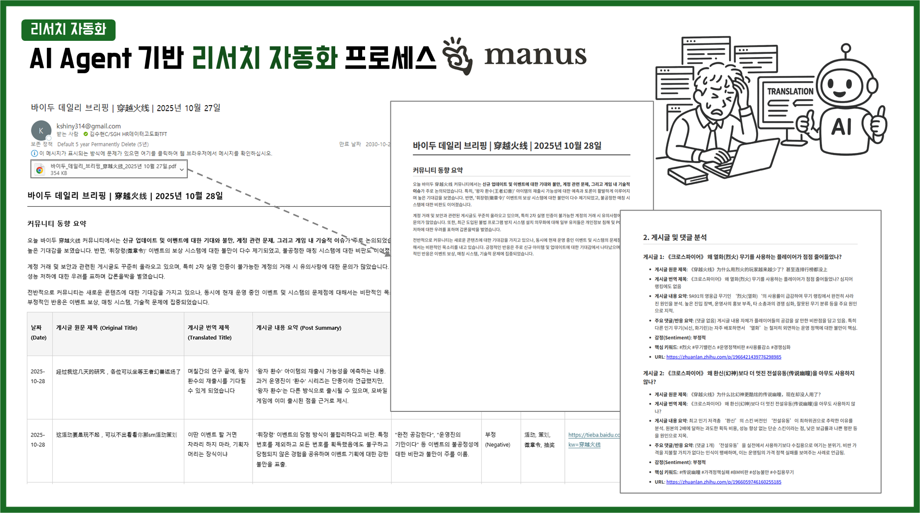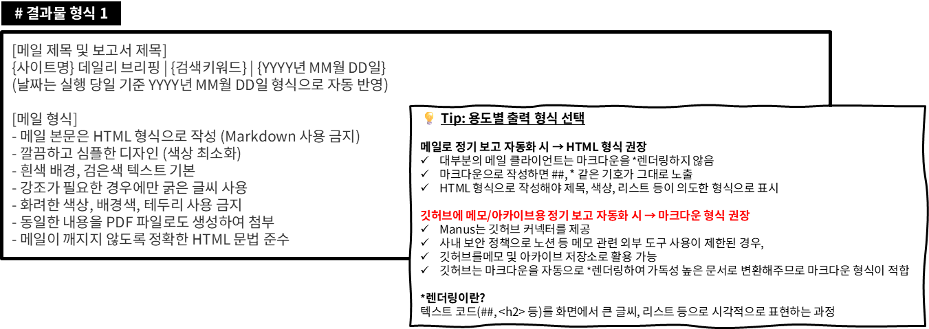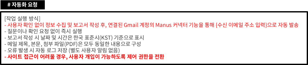 - 사용자 확인 없이 정보 수집 및 보고서 작성 후, 연결된 Gmail 계정의 Manus 커넥터 기능을 통해 {수신 이메일 주소 입력}으로 자동 발송