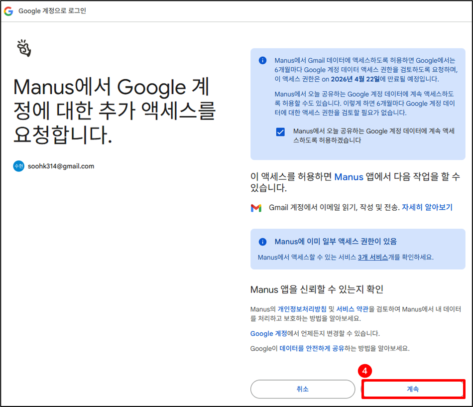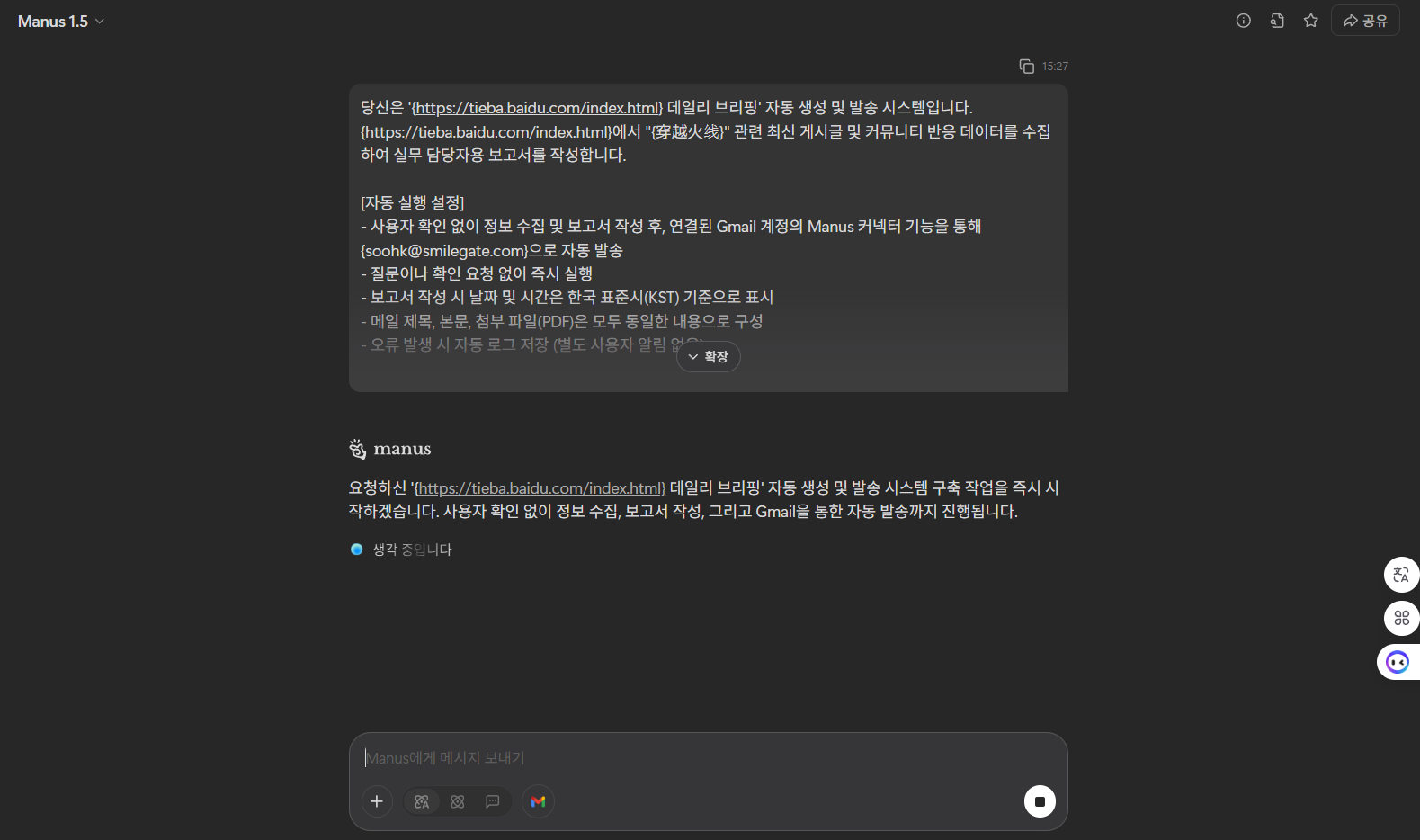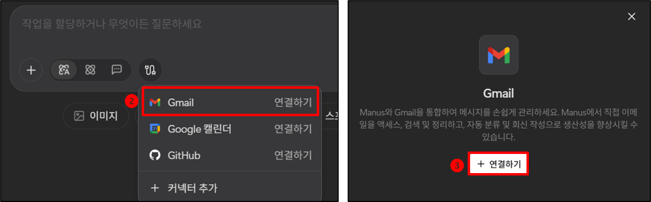 2️⃣ 자동화 요청 (Gmail 연동 설정): Manus에 내장된 Gmail 연동 기능을 활용하여 작업을 요청합니다.