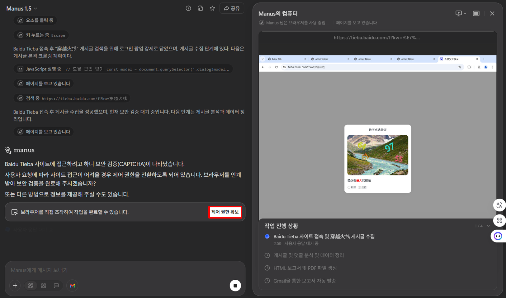 3️⃣ 보안 검증 방법 확인: 수집하고자 하는 사이트인 바이두에서 보안 검증(CAPTCHA)가 나타나는 것 확인 후 프롬프트에 요청한 것과 같이 사용자 접근 제어 권한 확보에 대한 질문을 확인 후 제어 권한 확보를 클릭합니다.