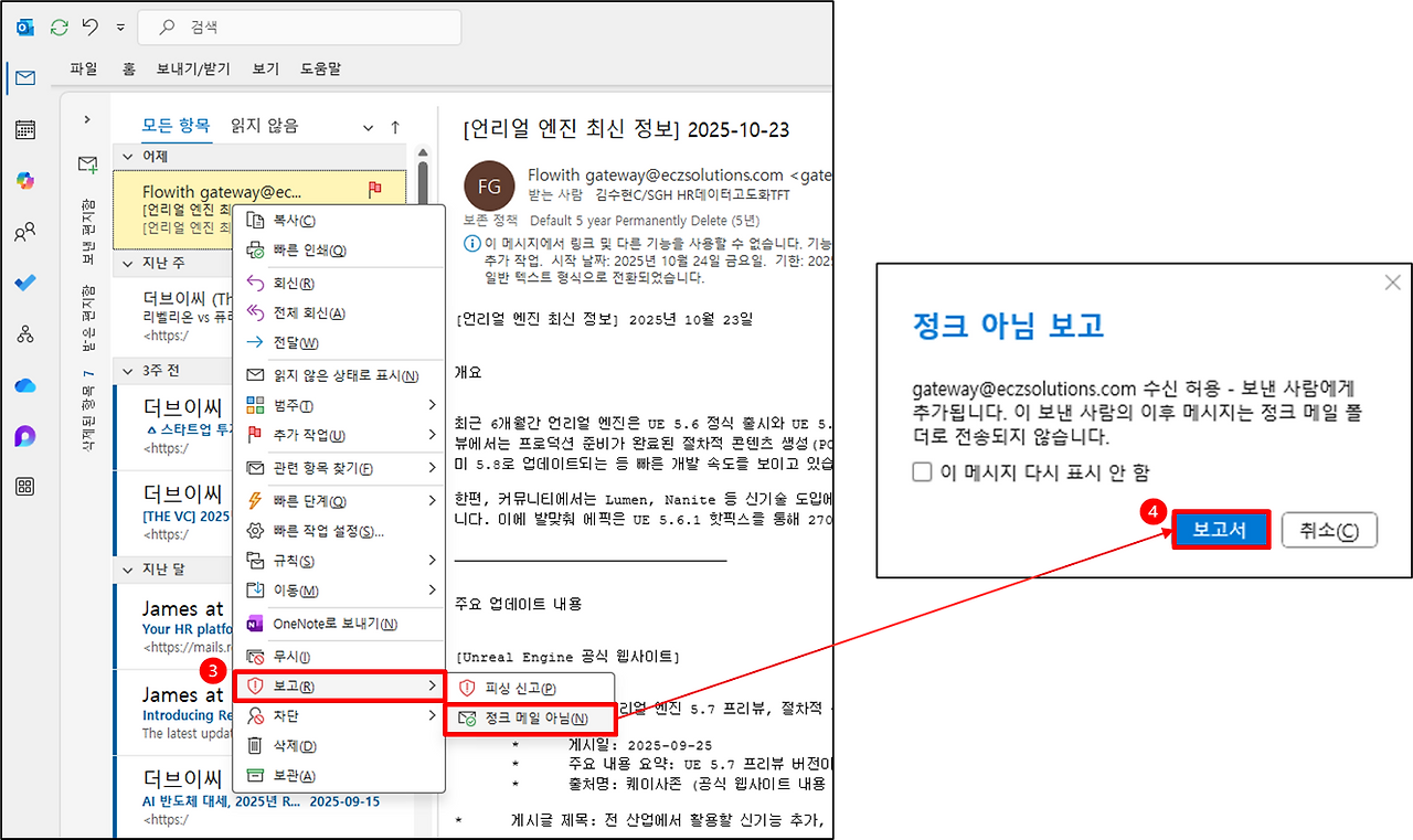 3️⃣ '보고' 버튼 클릭 → '정크 메일 아님' 선택