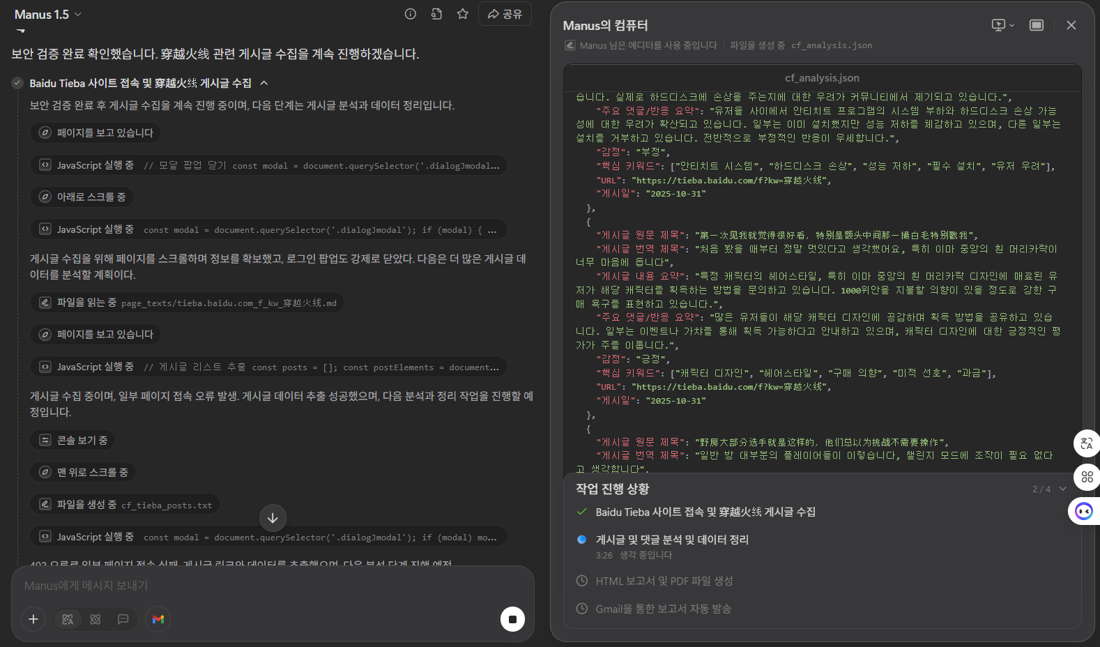 - 결론: 중국 사이트의 경우 완전 자동화는 제약이 있으나, Manus, Flowith, 퍼플렉시티 코멧 등의 AI Agent를 활용하면 리서치, 긍부정 분석, 데이터 수집 업무를 효과적으로 수행할 수 있습니다