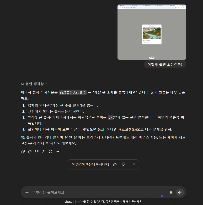 5️⃣ 보안 검증 방법 확인: 중국어로 되어있기 때문에 보안 검증을 어떻게 하는지 어려우니 생성형 AI(ChatGPT, Gemini, Claude 등)를 통해 질문하여 푸는 방법에 대해 익힙니다.