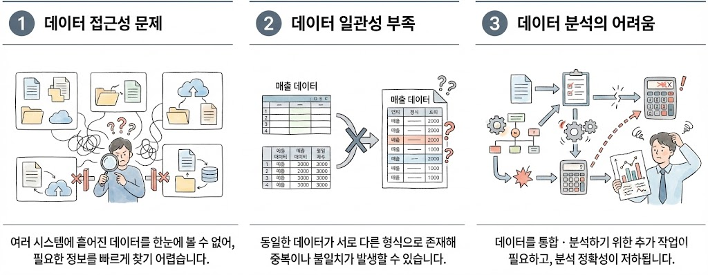 | ❶ 데이터 접근성 문제 | 여러 시스템에 흩어진 데이터를 한눈에 볼 수 없어, 필요한 정보를 빠르게 찾기 어렵습니다. |