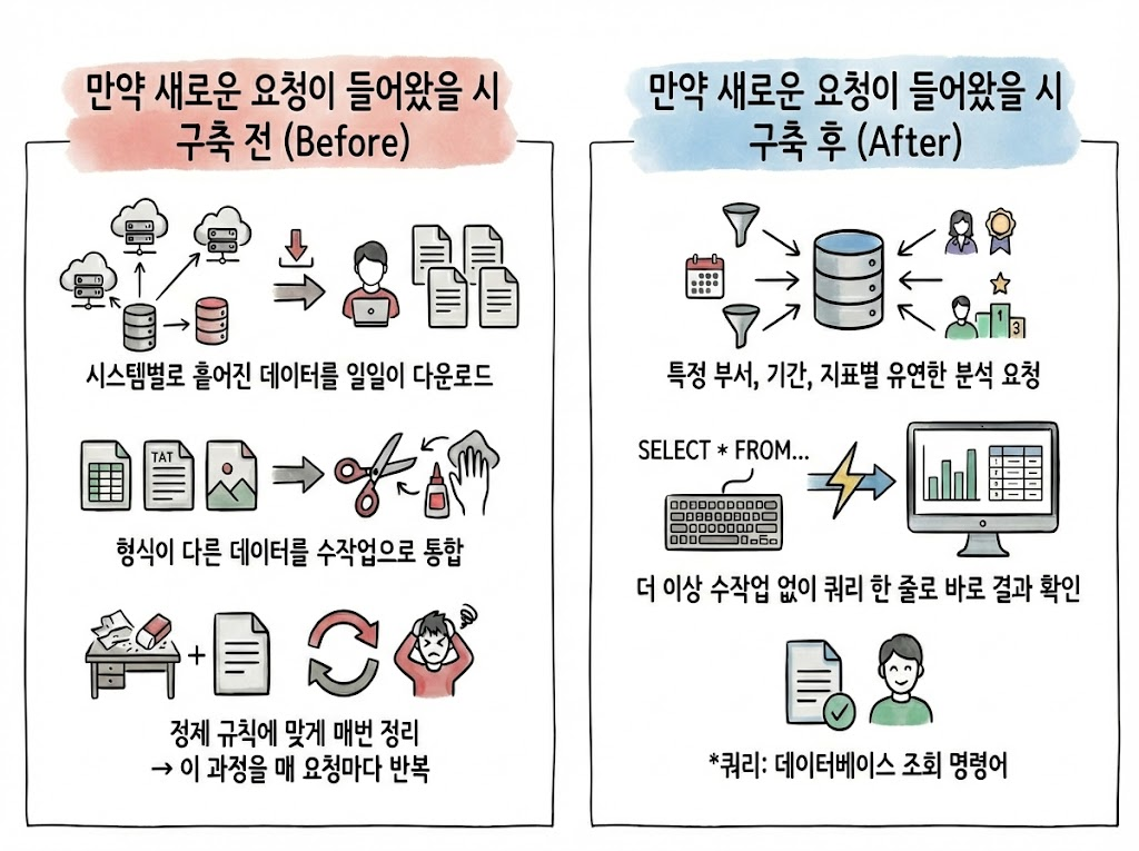 하지만 구축 후에는 이미 정제된 통합 저장소에서 *쿼리(Query) 한 줄로 즉시 결과를 얻을 수 있습니다.