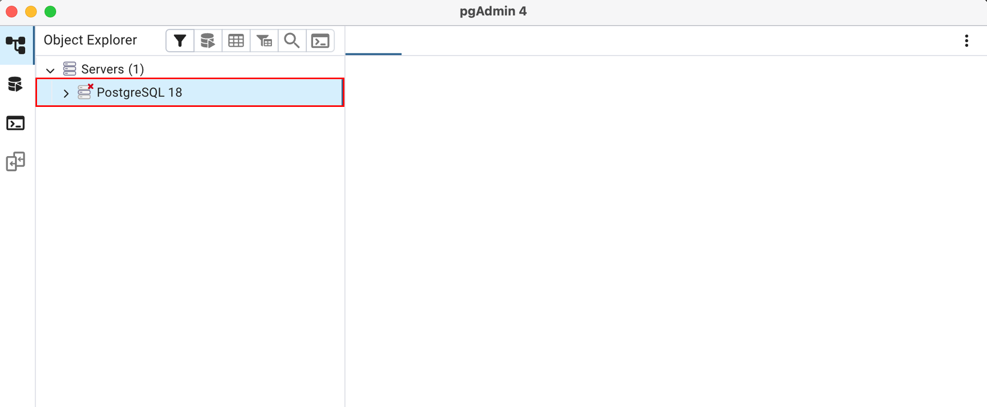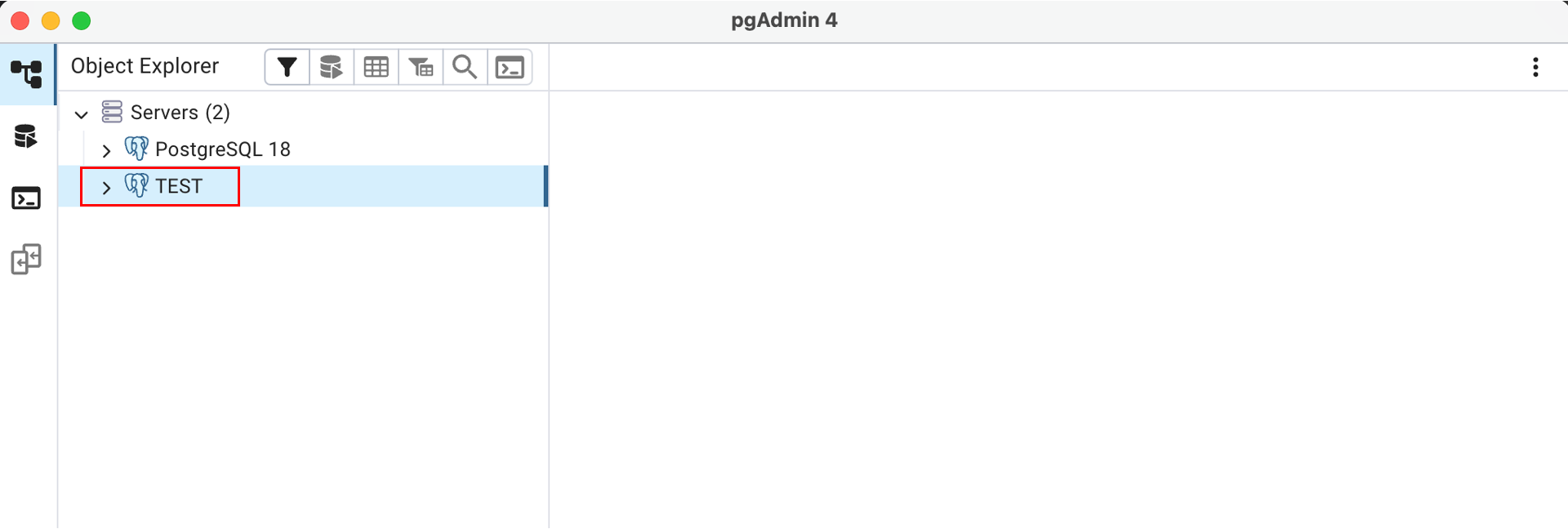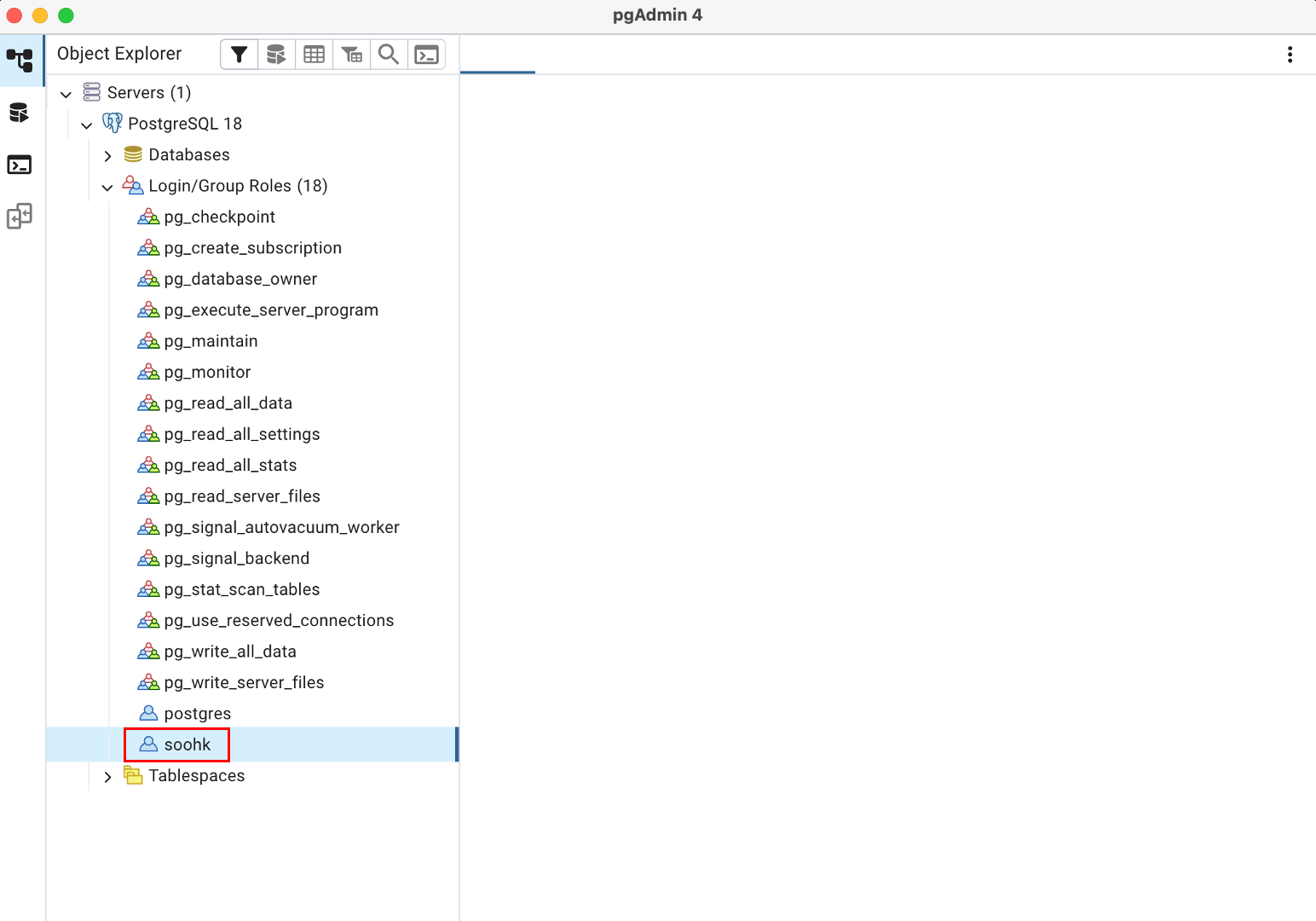 - 서버 연결: 왼쪽 탐색기(Browser) 창에서 Servers 항목을 확장합니다. PostgreSQL 18 항목을 더블 클릭합니다.