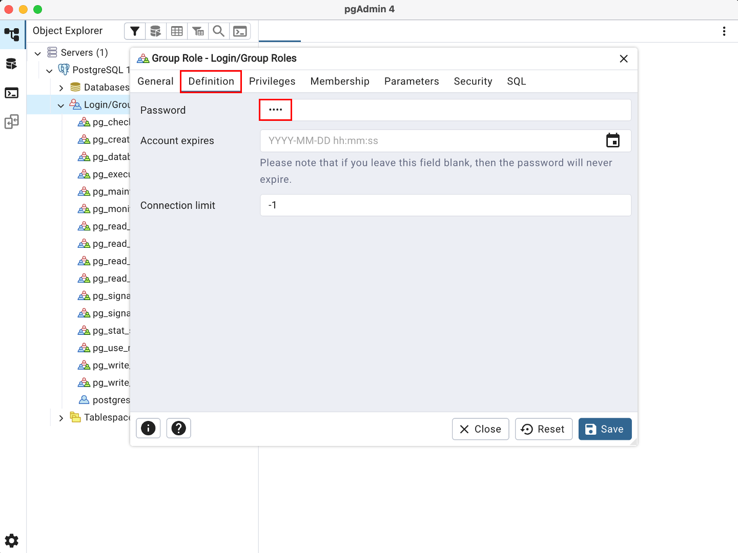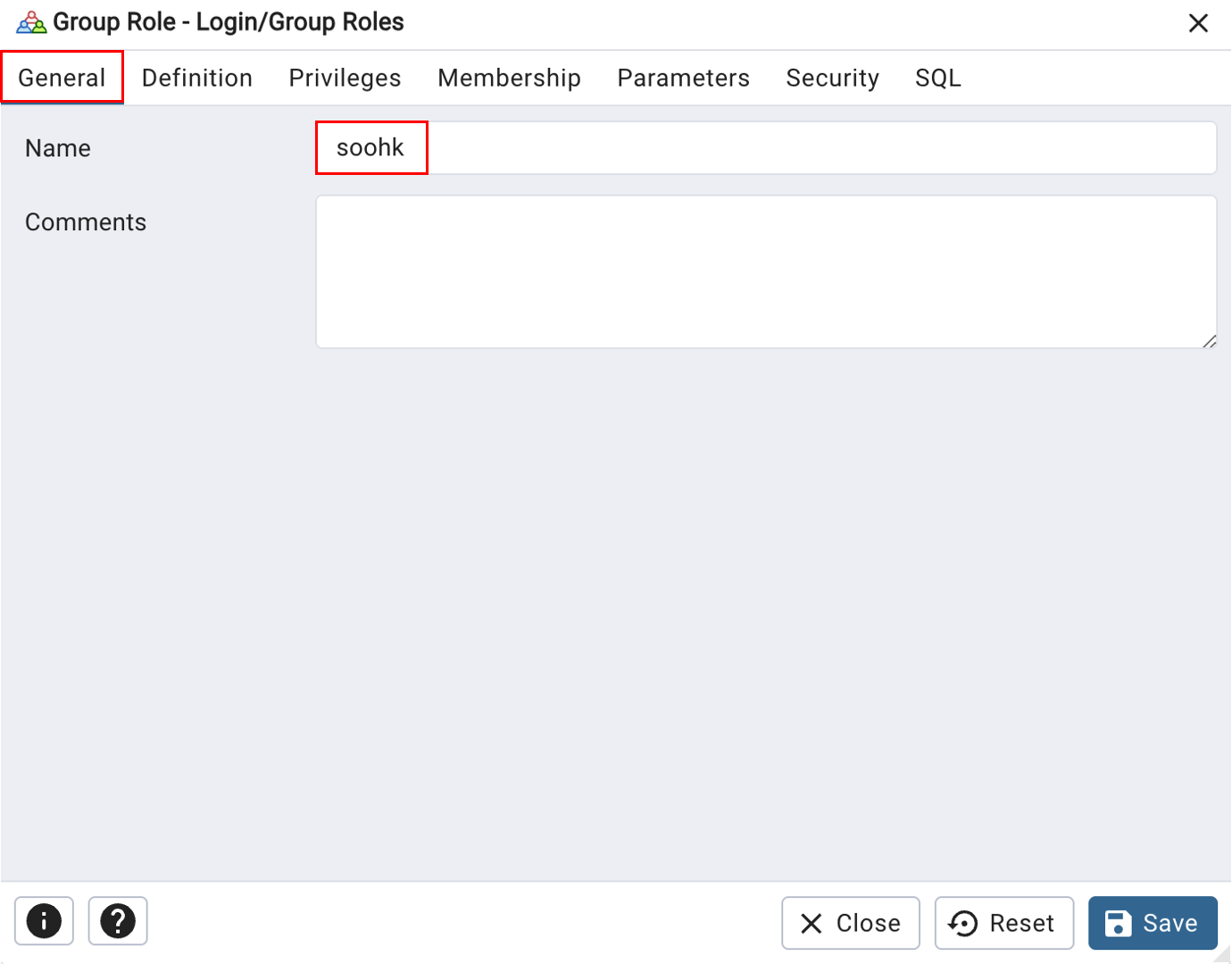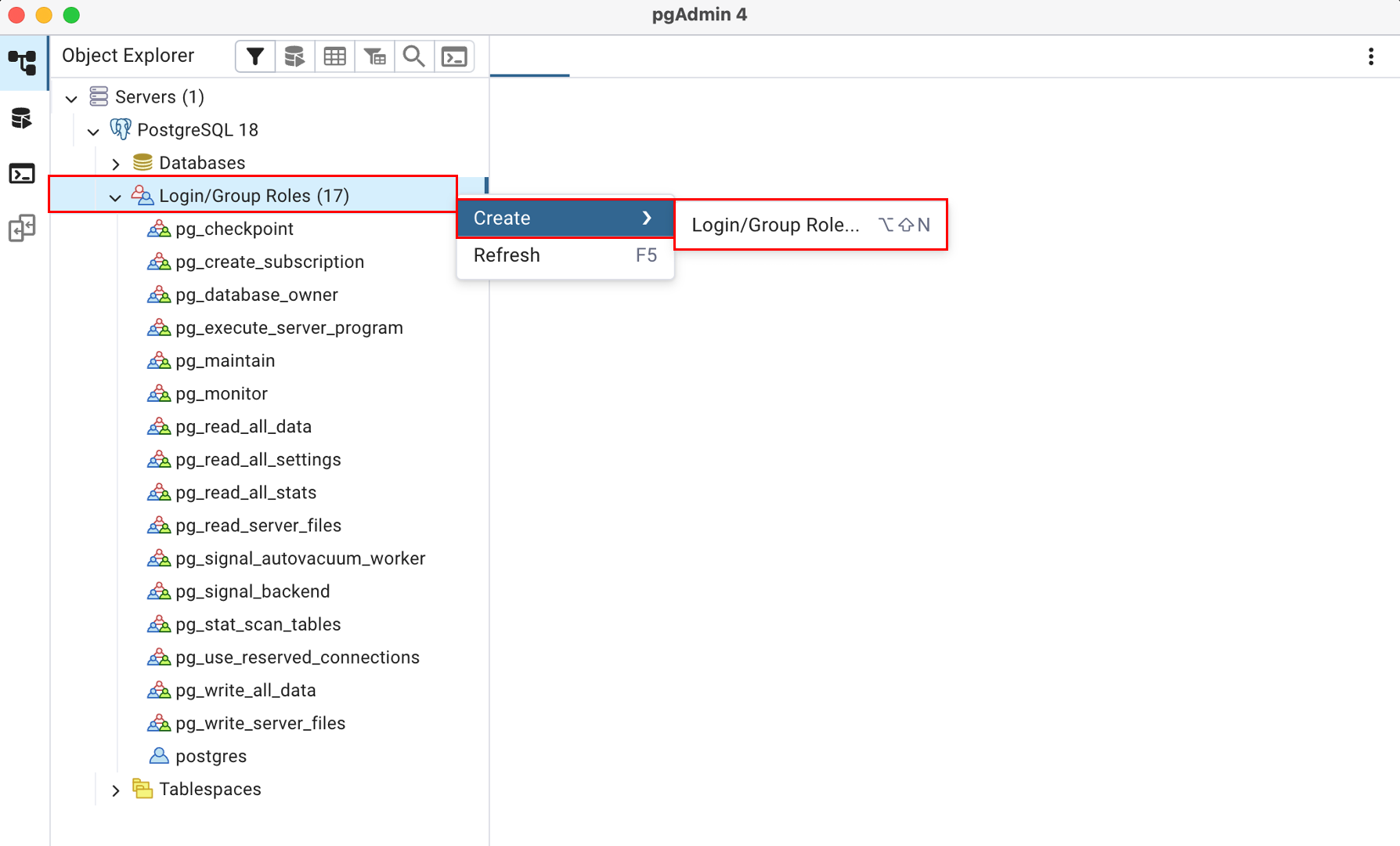- 메뉴 이동: Login/Group Roles 항목에서 우클릭 후 Create > Login/Group Role...을 선택합니다.