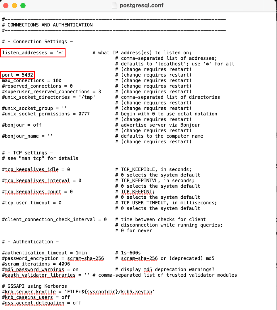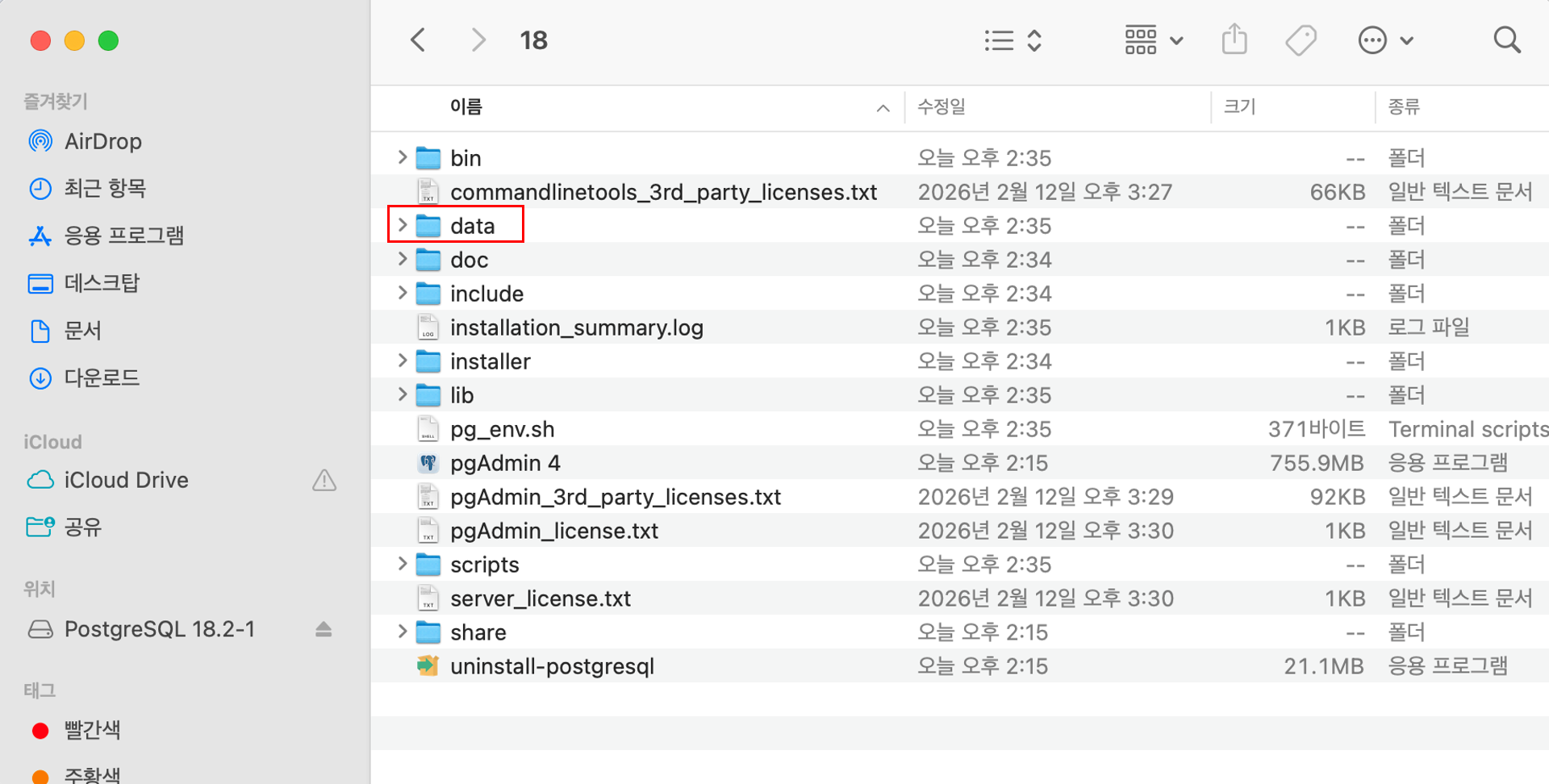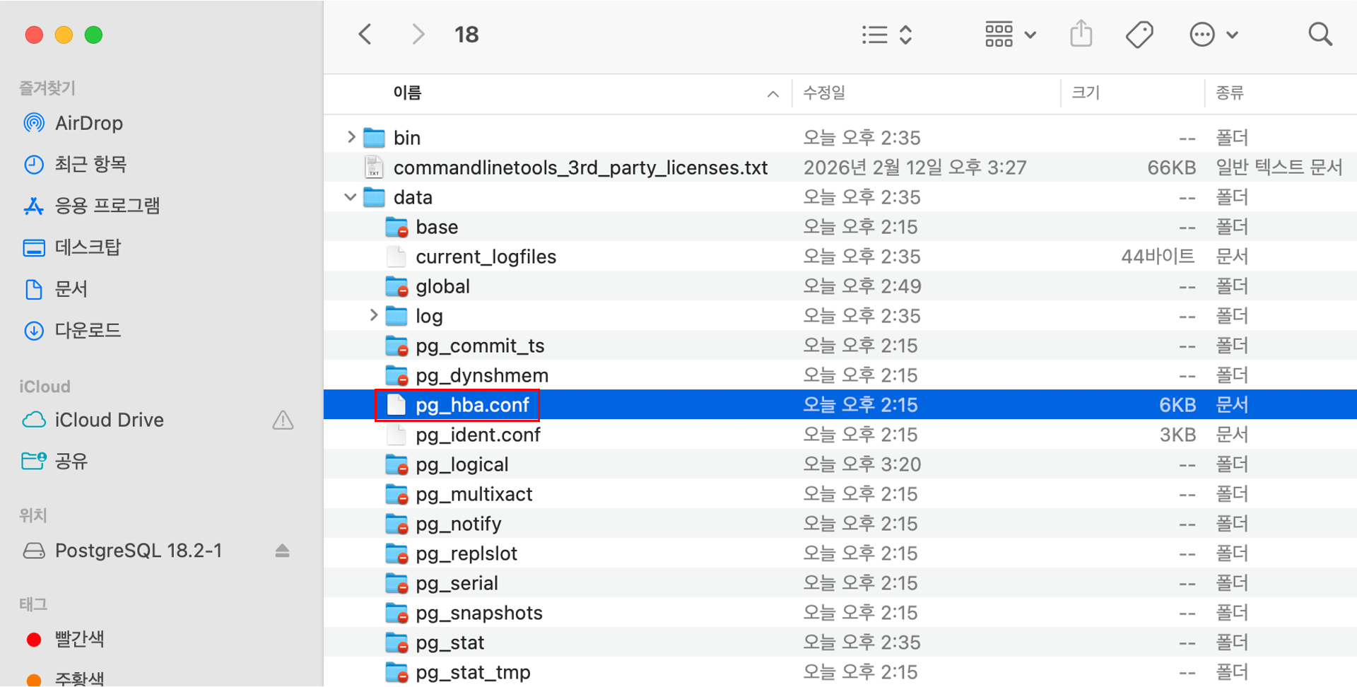외부 접속을 허용하기 위해 설정 파일(/Library/PostgreSQL/18/data 또는 설치 경로 내 data 폴더) 아래 2개를 수정해야 합니다.
