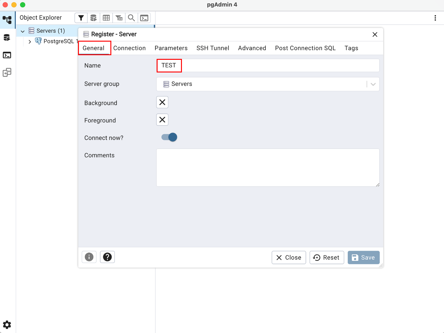 - pgAdmin 4 왼쪽 탐색기에서 Servers 우클릭 > Register > Server...를 선택합니다.