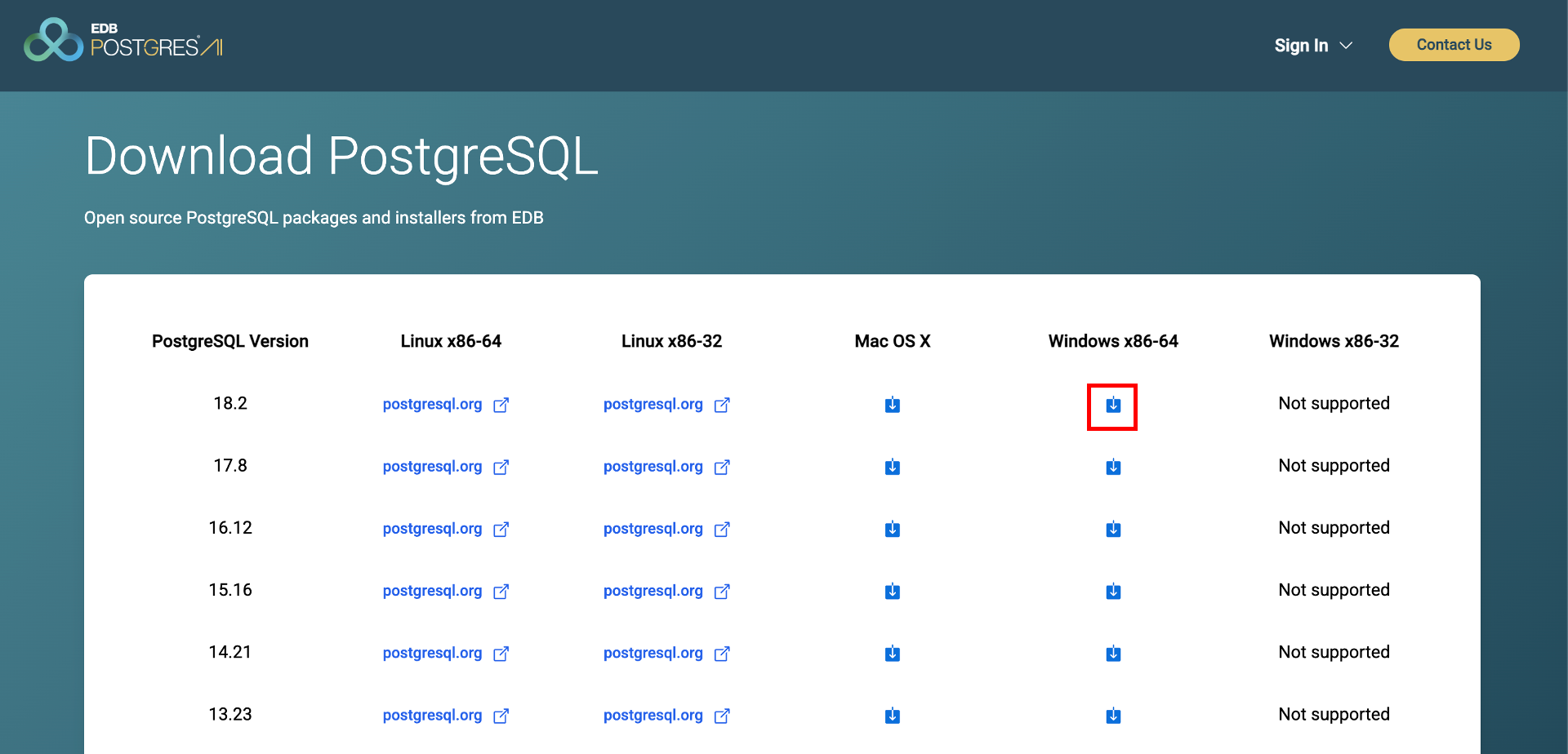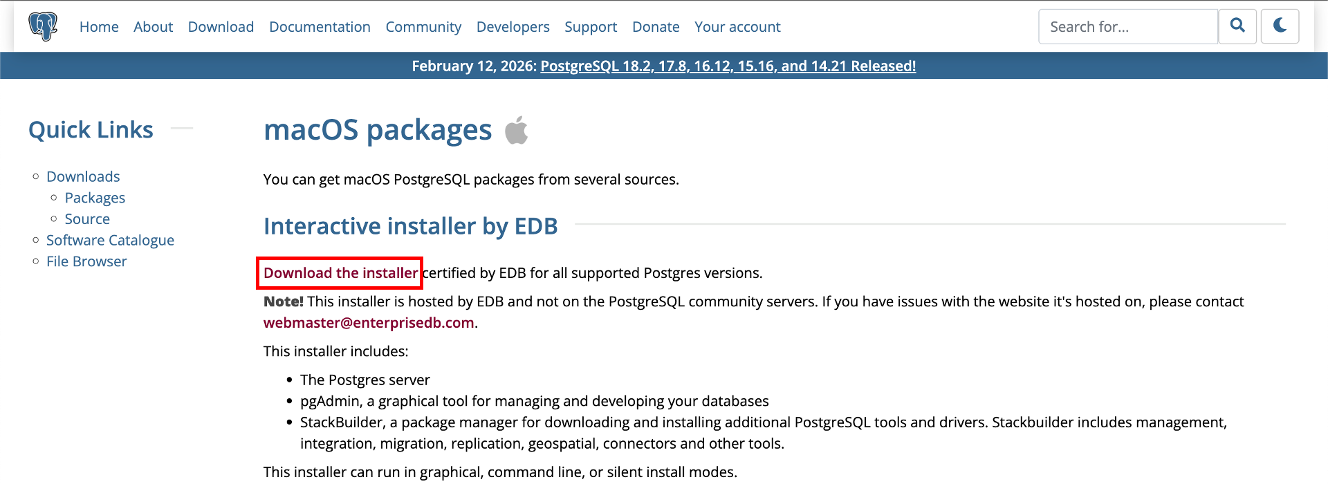 - 공식 홈페이지 접속: PostgreSQL Downloads 페이지로 이동합니다.